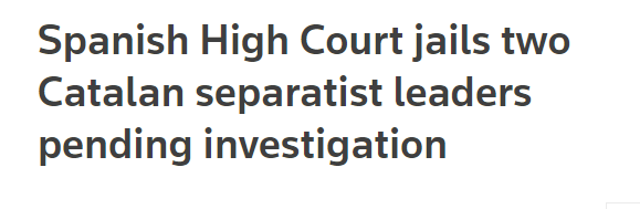 【西班牙拘禁加区独立组织两名领导人】西班牙高等法院周一拘禁了两名加泰罗尼亚独立组织的领导人,两人面临涉嫌煽动叛乱的调查,且不得保释。这是自10月1日独立公投以来西班牙政府第一次拘留独立阵营的领导人。Jordi Sanchez和Jordi Cuixart分属与ANG和Omnium组织。检察院称两人在协调独立示威抗议活动中发挥了核心作用,在9月的抗议活动中煽动人群把西班牙国家警察围困在建筑物内,并损毁了警车。