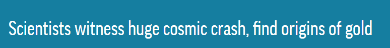 【科学家首次观测到双中子星合并,找到地球金子来源】美东时间周一上午LIGO实验室等联合全球数十家天文台共同发布消息,宣布人类历史上第一次探测到双中子星合并所产生的引力波。通过对光等能量的测量可以帮助科学家了解地球上的伽马射线暴是如何产生的、宇宙的扩展速度有多快以及铂金和金子等重金属是怎样产生的。哈勃太空望远镜甚至拍到了余晖的快照。