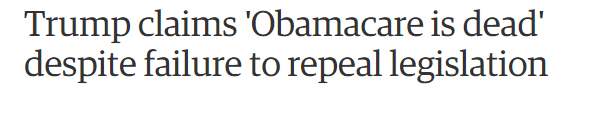 【特朗普称奥巴马医保已死】特朗普周一推脱了自己应该对未能废除和替代“奥巴马医保案”负责:“我很诚实的说,是他们没有完成这项工作,我没有责任。”尽管共和党人在9月份参议院的一次投票中一票之差未能废除奥巴马医保,但是特朗普坚称奥巴马医保案“已经死了,消失了,你甚至都不应该提及它。”随后特朗普还与参议院多数党领导人麦康奈尔举行了新闻发布会,称后者为“朋友”:“我和这位绅士的关系非常好。”特朗普曾在8月份攻击麦康奈尔没有废除奥巴马医保案是“耻辱”。