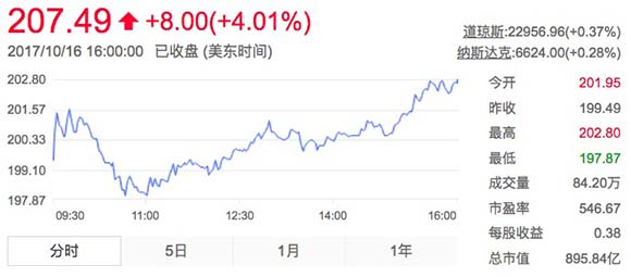根据最新发布的2017年第三季度财报来看,Netflix已经实现了当时的目标并在财务方面小幅超出华尔街的预期。截至美东时间10月16日收盘,Netflix股价上涨4.01%,报收207.49美元。