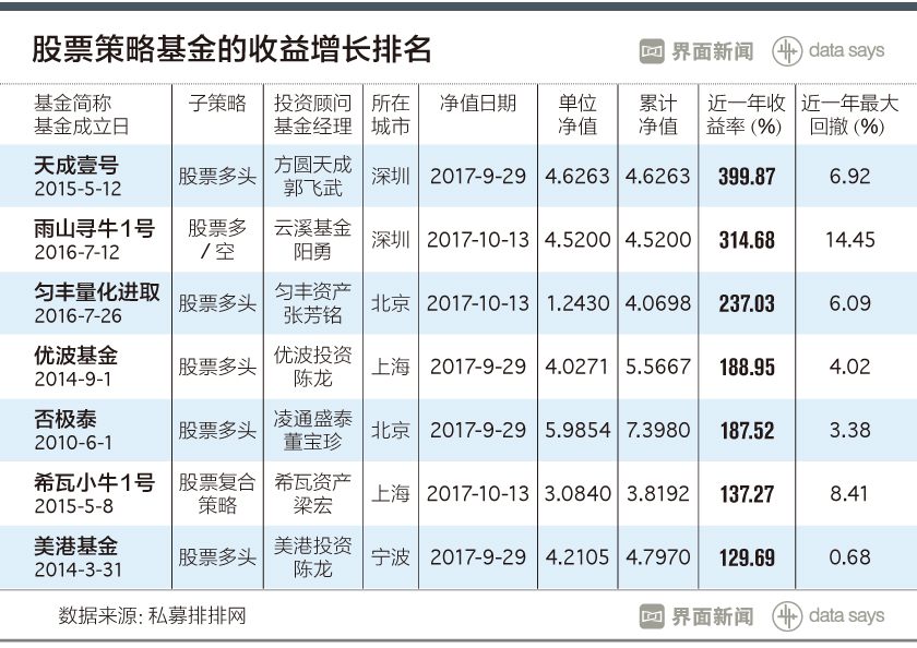除了在具体投资策略上进行调整以外,还有不少私募管理人更倾向于跨市场操作,去港股市场寻求低估值标的。典型的如方圆天成旗下的“天成壹号”。“天成壹号”成立于2015年5月,自今年以来,净值开始飙升,特别是5-9月,5个月内区间涨幅超200%。截至9月29日,该产品最新净值为4.6263,近一年收益率为399.87%。