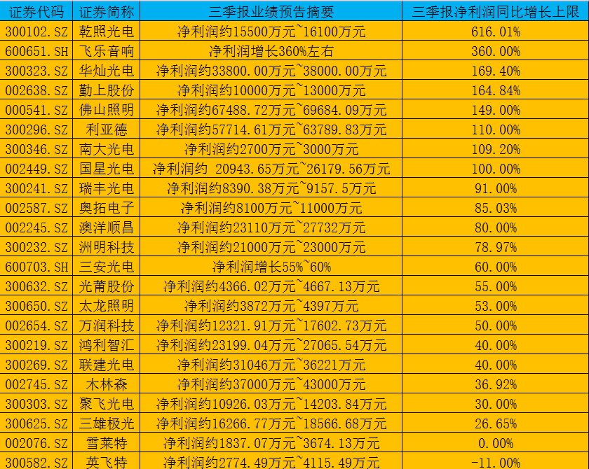 截至到10月17日,Wind数据显示,A股LED板块的32家上市公司中已经有27家公布了三季报业绩预告,界面新闻统计后发现(以净利润同比增长上限进行统计),这27家上市公司中除了德豪润达(002005.SZ)、艾比森(300389.SZ)和雷曼股份(300162.SZ)三家公司之外,其余公司今年前三季度归属于母公司股东的净利润(下称净利润)全部实现同比增长,其中有八家公司的净利润实现了翻倍式增长,具体情况如下表所示: