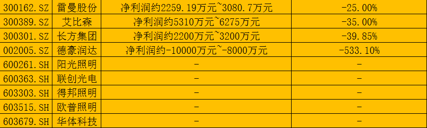 从同比增速超过100%的八家公司来看,其中上游芯片端有乾照光电(300102.SZ)以及华灿光电(300323.SZ)两家公司;中游封装端包括国星光电(002449.SZ)一家公司;下游应用端则包括飞乐音响(600651.SZ)、勤上股份(002638.SZ)、佛山照明(000541.SZ)以及利亚德(300296.SZ)等四家公司;另外还有从事LED制造核心材料MO源的南大光电(300346.SZ)。