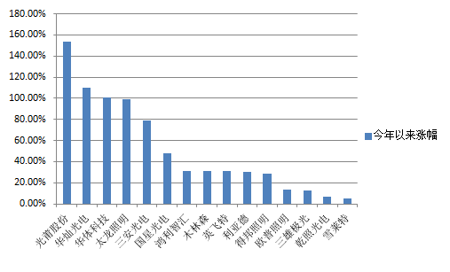 Wind数据显示,行业32家公司今年涨幅为正的仅有15家,其中除去光莆股份(300632.SZ)、华体科技(603679.SH)、太龙照明(300650.SZ)、得邦照明(603303.SH)以及三雄极光(300625.SZ)5家今年上市的公司之外,其余10家公司中多数为产业链各环节的龙头公司,如LED上游芯片端的三安光电(600703.SH)和华灿光电(300323.SZ)、中游封装领域的木林森(002745.SZ)和国星光电(002449.SZ),下游应用领域的利亚德(300296.SZ)和欧普照明(603515.SH)。