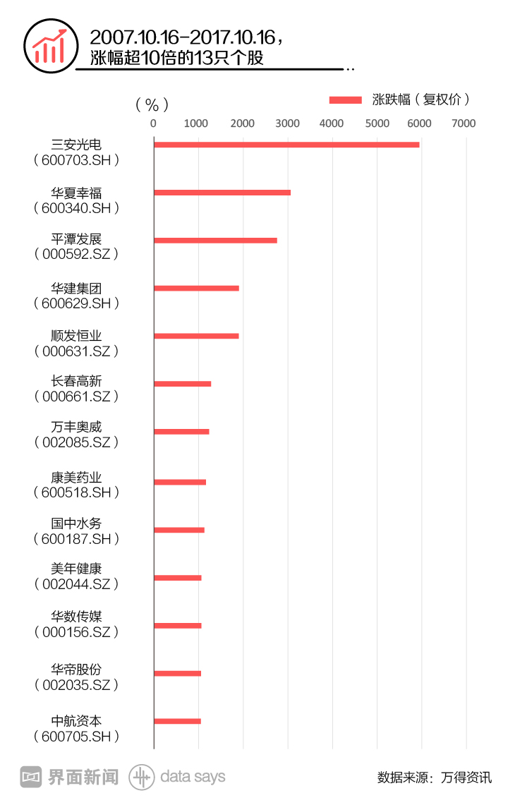 不过从复权来看,已有986只股票超过上证综指在6124点时对应的股价,476只股票低于当时水平,即超过2/3的股票创出新高。十年期间三安光电(600703.SH)、华夏幸福(600340.SH)和平潭发展(000592.SZ),分别以59倍、30倍和27倍的涨幅高居10年涨幅榜前三,涨幅在10倍以上的股票共有13只。