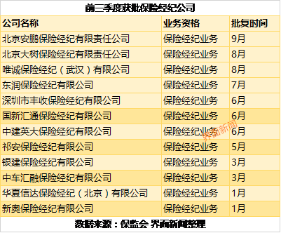 简而言之,经纪公司整合了保险销售、产品和理赔资源,是深入保险业务最深的保险中介公司。正因如此,经纪牌照是资本最热衷的保险中介牌照,界面新闻根据保监会官网披露整理,前三季度共有12家保险经纪公司获批成立,如图。