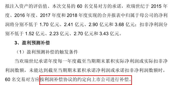 在借壳星美时,欢瑞世纪承诺,2016年、2017年和2018年度合并报表归属于母公司净利润将分别不低于2.41亿元、2.90亿元和3.68亿元;扣非净利润分别不低于2.23亿元、2.70亿元和3.43亿元。
