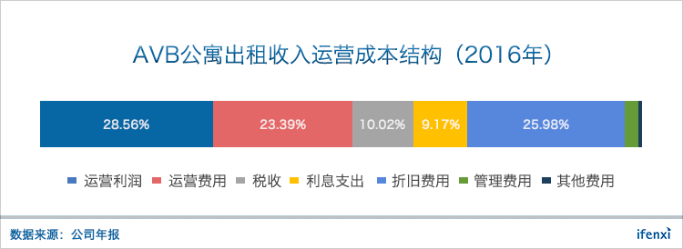 从公寓出租收入部分的运营成本结构来看,AVB最大成本来自日常运营费用和物业折旧摊销,合计占到50%左右,其次是税收和利息支出,运营利润率达28.56%。