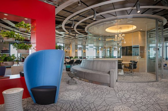 可能是受到 WeWork 在办公空间开辟健身房的启发,工作室接到的设计方案也要求在计划面积达 2500 平米的开放空间内设立休息区、健身区和跨部门联合办公区。最后呈现出来的效果令人颇为满意。办公室整体极具现代感,“细节分明,配色也很大胆。”是外媒对这间办公室的第一印象。