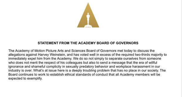 除了公司层面,美国包括欧洲影视行业各大机构都纷纷做出反应。戛纳电影节对其强烈谴责,英国电影学院发声明谴责了韦恩斯坦的卑劣行为并终止了他的会员资格,法国已经开始撤销其法国荣誉军团骑士勋章的程序。而最受关注的奥斯卡主办方美国电影艺术与科学学院(AMPAS)虽然没有第一时间做出反应,但在包括史蒂文·斯皮尔伯格、汤姆·汉克斯、乌比·戈德堡与凯瑟琳·肯尼迪等重量级人物在内的54名奥斯卡组委会成员举行紧急会议后,做出一个罕见的决定严厉决定,学院理事“远远超过三分之二”的成员投票同意:立即取消哈维·韦恩斯坦的学院成员资格。