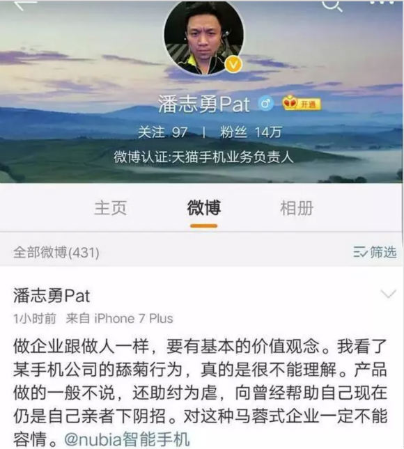 中兴Nubia因此不满,在2016年双十一期间,Nubia选择将自家的新款产品放在苏宁竞争对手——京东平台上独家发售。苏宁背后的阿里直接不愿意了,天猫手机负责人直接在微博上点名骂Nubia。
