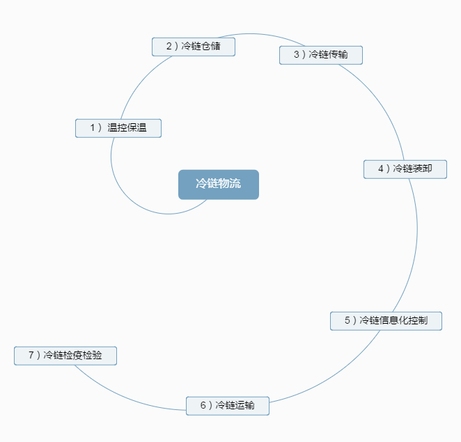 1)温控保温冷库:对储藏物品的温度湿度有精确要求的冷库,包括恒温恒湿冷库。2)冷链仓储冷链仓储一般用于生鲜农产品类,通过仓库对商品与物品的储存与保管。3)冷链传输在一定温度下,通过对所需的传输机械设备、器具等的使用,达到对生鲜农产品的分类拣选、包装。4)冷链装卸冷链装卸时要进行物品温度检测。冷藏、冷冻物品的卸货时间需要按规定要求,对卸货车辆与卸货仓库进行密封处理,保证卸货期间物品温度升高控制在允许范围。且卸货作业中断时,要即时关闭运输设备厢体门,保持制冷系统保持正常运转。5)冷链信息化控制冷链物流信息化系统关键技术包括:信息采集与跟踪技术、信息传输与交换技术、信息处理技术。信息技术是现代冷链物流神经系统,易于实现对企业全部资源进行战略协同管理,降低冷链物流成本。6)冷链运输冷链运输(Cold-chain transportation),是指在运输全过程中,无论是装卸搬运、变更运输方式、更换包装设备等环节,都使所运输货物始终保持一定温度的运输。冷链运输方式可以是公路运输、水路运输、铁路运输、航空运输,也可以是多种运输方式组成的综合运输方式。7)冷链检疫检验冷链检疫检验需要建立规范有序的食品检疫检验工作,安排专人管理运输量大、距离远和污染概率高的运输工具,做好常规的清洗、消毒等卫生处理,并落实冷链物流的实时监控和温度记录工作,确保食品在运输过程中质量状态符合要求,保障进口食品安全卫生。