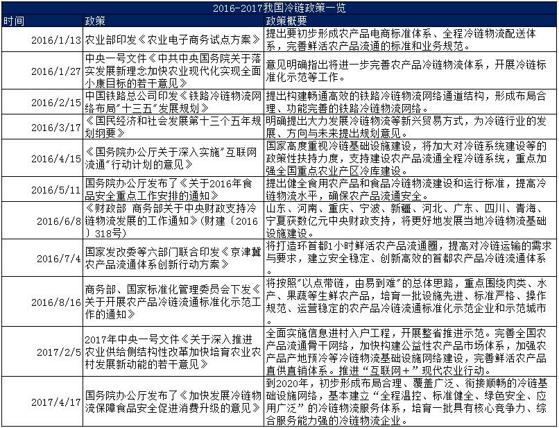 冷链物流发展的政策环境持续利好,国家“一带一路”倡议深入实施,开创了冷链物流发展的新局面。 2017年4月份国务院办公厅发布了《加快发展冷链物流保障食品安全促进消费升级的意见》,提出了十条冷链物流发展思路,行业监管力度会不断加强。提出了发展目标:到2020年,初步形成布局合理、覆盖广泛、衔接顺畅的冷链基础设施网络,基本建立“全程温控、标准健全、绿色安全、应用广泛”的冷链物流服务体系,培育一批具有核心竞争力、综合服务能力强的冷链物流企业。