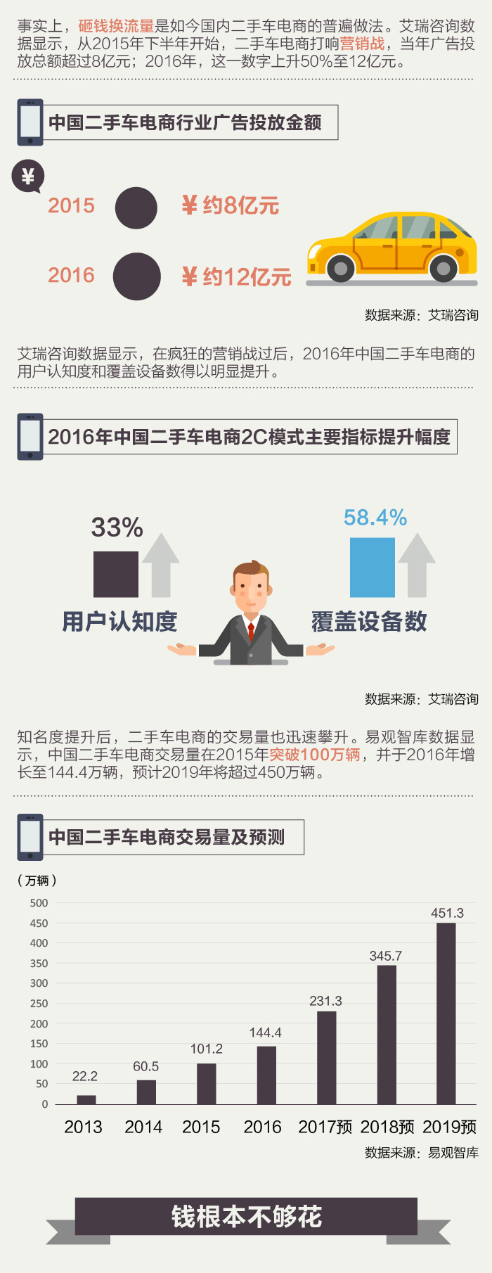 从2015年下半年开始,二手车电商打响营销战,当年广告投放总额超过8亿元;2016年,这一数字上升50%至12亿元。