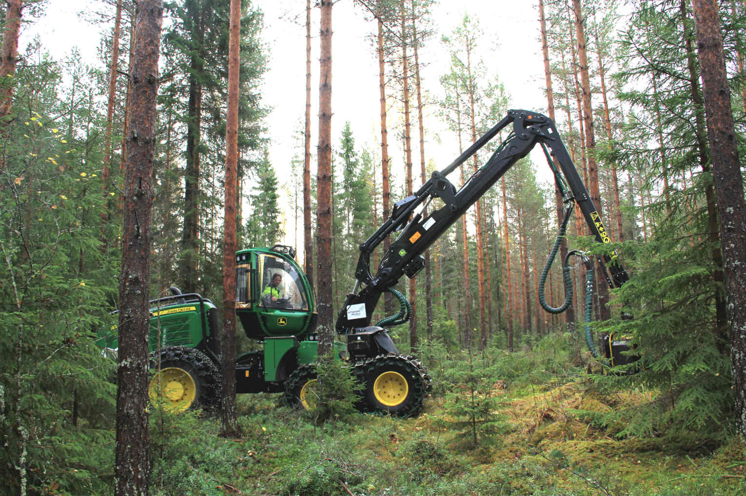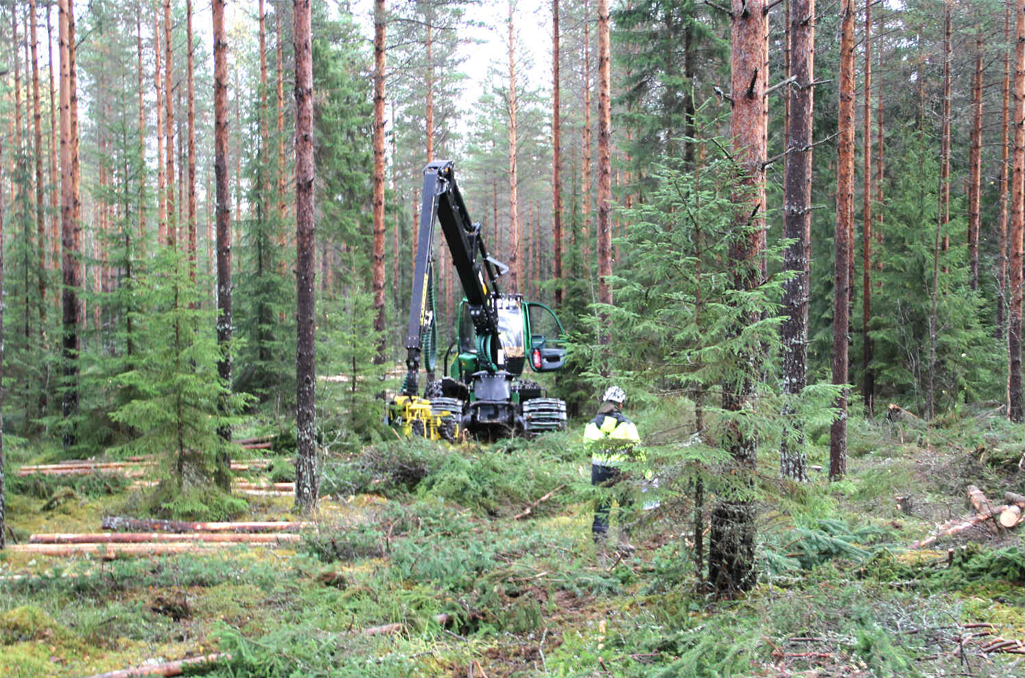 在芬兰南部Janakkala一片面积约8000公顷的天然林中,伐木工Kimmo Malmber操纵着伐木机,对这片平均树龄约57年的森林进行着第二次间伐。在短短15秒内,kimmo就完成了选择树木、砍伐、剥皮、将树干截成三段的全过程。