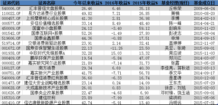第三类,消费类基金。行业类基金一向是风水轮流转,很难有某一类基金近几年都保持高收益,但近三年的消费类基金成了特例。白酒、家电、食品等细分板块的轮番上涨,使得部分押对了宝的消费基金受益。从上表可以看到,有至少4只名称中带有“消费”的基金上榜,其中3只连续三年均获得正收益。今年业绩最好的易方达消费行业(110022)收益近50%。