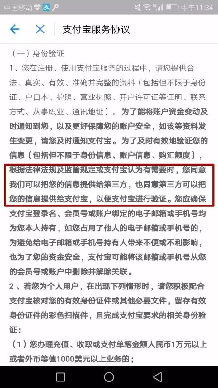 近日,独角金融也研究了下支付宝的服务协议,并发现了这样的条款:为了及时有效的验证您的信息(包括但不限于身份信息、账户信息、购汇额度),根据法律法规及监管规定或支付宝认为有需要时,您同意我们可以把您的信息提供给第三方,也同意第三方可以把您的信息提供给支付宝,以便支付宝进行验证。