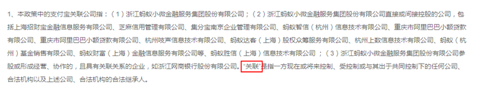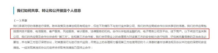 第二个疑问,支付宝在《支付宝隐私政策》中对信息共享的第三方范围做了说明,即支付宝关联公司、供应商及合作伙伴被称为“第三方”。供应商包括提供技术服务、电信服务、客户服务、风控服务、审计服务、法律服务的机构;合作伙伴包括金融机构、电子商务公司及平台、线下商户;“关联”则是指一方现在或将来控制、受控制或与其出于共同控制下的任何公司、合法机构以及上述公司、合法机构的合法继承人。