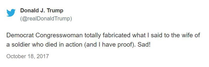 18日,特朗普在Twitter上发文,否认自己讲过这些话:“民主党的国会女议员完全编造了我对一名阵亡士兵遗孀所说的话(而且我有证据)。伤心!”