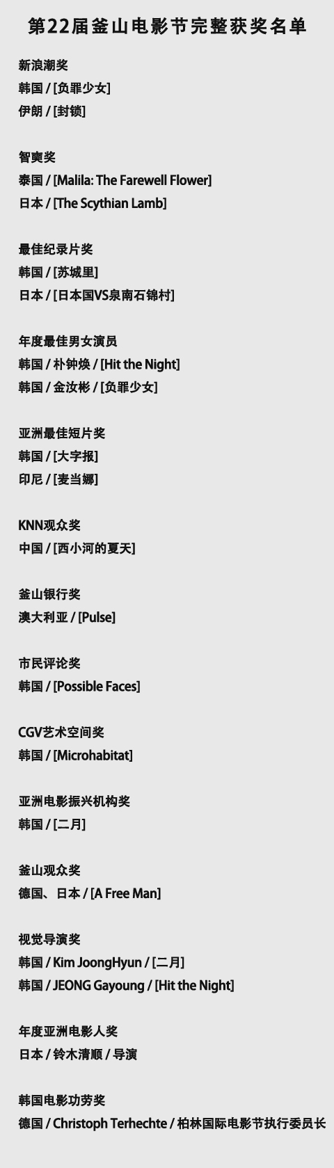 10月21日,第22届釜山电影节获奖名单揭晓,韩国影片《负罪少女》以及伊朗影片《封锁》摘得新浪潮奖,韩国演员朴钟焕、全汝彬分获年度最佳男、女演员奖,而年度亚洲电影人奖则授予了今年2月逝世的日本导演铃木清顺,中国导演周全作品《西小河的夏天》获得KNN观众奖,也是本次唯一一部获奖的中国电影。