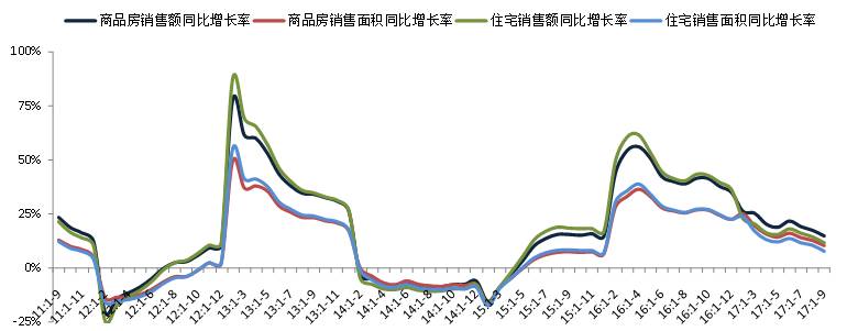 全国房屋新开工、施工、竣工同比增幅均继续收窄。2017年1-9月,全国房屋新开工面积为131033万平方米,同比增长6.8%,增幅较1-8月收窄0.8个百分点;其中,住宅新开工面积为94113万平方米,同比增长11.1%,较1-8月收窄0.5个百分点。全国房屋施工面积达73.8亿平方米,同比增长3.1%,增速与1-8月持平;其中,住宅施工面积为50.5亿平方米,同比增长2.9%,较1-8扩大0.1个百分点。全国房屋竣工面积为57694万平方米,同比增长1.0%,增速较1-8月收窄2.4个百分点;其中,住宅竣工面积为41260万平方米,同比下降1.9%,降幅较1-8月扩大2.4个百分点。