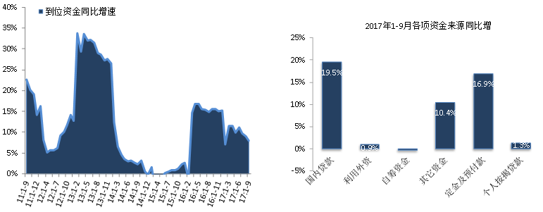 图:2011年至今全国开发企业到位资金同比增速及2017年1-9月各项资金来源同比增速