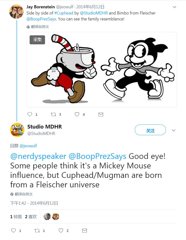 推特上官方表示茶杯头形象是来源弗莱舍而非米老鼠