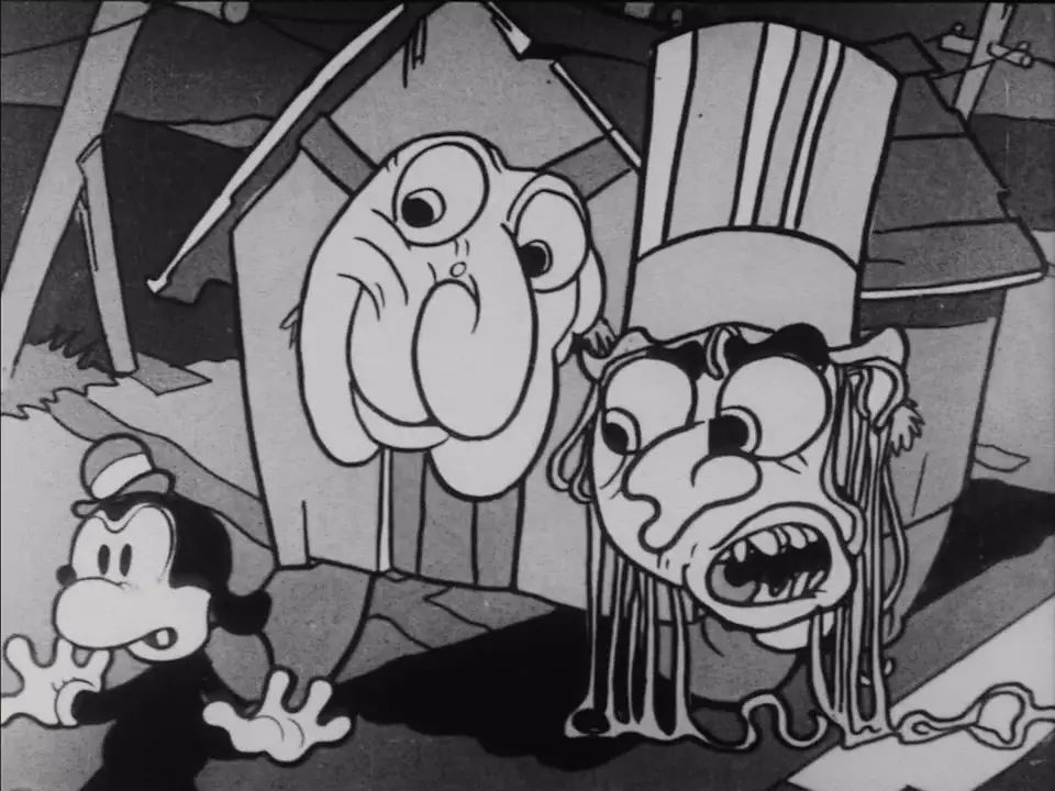 这部《Swing You Sinners!》堪称美国动画黄金年代最黑暗的一作:小狗宾宝因为偷了一只鸡,被警察追赶时误入一片墓地。幽灵纷纷从墓地中游出,指着宾宝的罪行,墓碑和枯树等无生命物体也变身恶鬼,甚至连宾宝的影子也加入其中。恐怖之余,却又带着荒诞古怪的趣味。