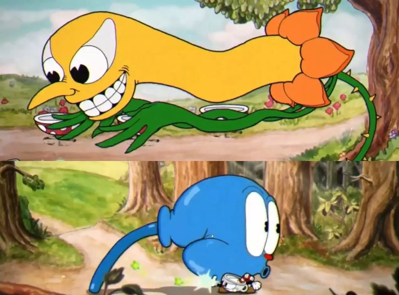 显然,这种古怪的趣味是《茶杯头》在重新30年代风格时最看重的一点。我们可以看到《茶杯头》中不仅有着众多动植物甚至非生命体的妖怪BOSS,他们的面部形变更多采取的是弗莱舍的诡异橡皮管风格。一个典型的例子是嘴部经常会忽视结构,变形成一个突出的瓶口。
