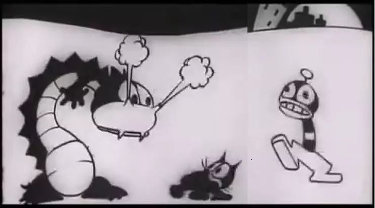 《Woos Whoopee》就是这样一部作品,菲力猫在酒后回家的路上,整个城市都发生了变形,街上的路灯、理发店门口的条纹柱都变成了妖怪,路灯甚至变形成一条恶龙追赶菲力猫。