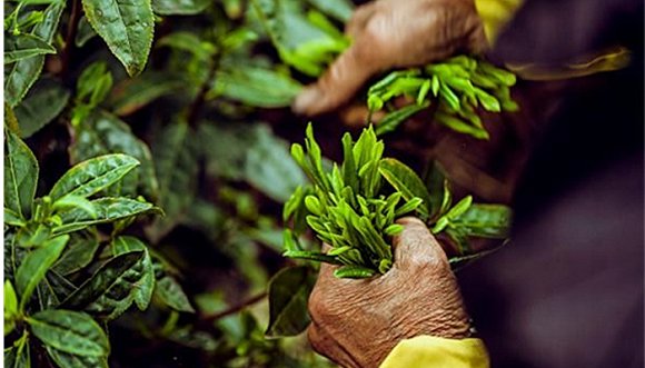安徽黄山,茶农李爷爷正在采摘茶叶