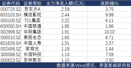 次新股走势活跃,横店影视(603103.SH)、华阳集团(002906.SZ)封板涨停,并分别获主力净流入2.44亿元、1.91亿元。电子板块午后走强,主力资金扎堆抢筹京东方A(000725.SZ)、欧菲光(002456.SZ)、长信科技(300088.SZ)等标的个股,其主力净流入额分别为2.59亿元、1.18亿元、1.13亿元。受业绩预增消息提振,中国联通(600050.SH)、中国人寿(601628.SH)重获主力资金关注,分别实现净流入1.95亿元、1.31亿元。