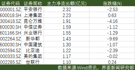 银行板块人气低迷,平安银行(000001.SZ)、兴业银行(601166.SH)首当其冲,两只个股分别遭遇净流出2.32亿元、1.55亿元,股价亦分别下挫2.53%、1.29%。上港集团(600018.SH)遭主力资金净流出2.23亿元。此前股价一路飙涨且创下历史新高的新华都(002264.SZ)早盘遭遇砸盘跌停,尽管盘中打开跌停,但收盘仍大跌9.69%,主力净流出1.43亿元。此外,昆仑万维(601668.SH)、中信证券(600030.SH)、中国建筑(600030.SH)、比亚迪(002594.SZ)、美的集团(000333.SZ)、世联行(002285.SZ)等个股亦遭遇主力资金大举抛售,分别净流出1.91亿元、1.59亿元、1.30亿元、1.22亿元、1.17亿元以及1.10亿元。