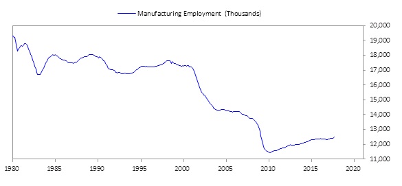 出现这种情况,主要是因为自1997年以来,大约有30%的制造业岗位减少: