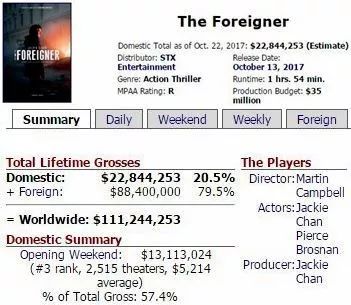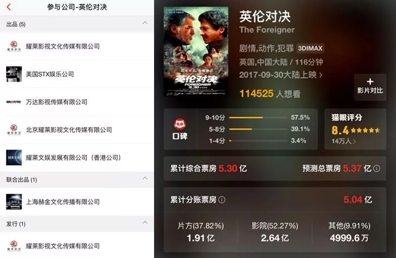 《英伦对决》由中国的耀莱影视、万达影视,美国的STX娱乐等公司联合投资,成龙担任主演兼制片人,制作预算3500万美元(折合约2.3亿人民币)。目前中国净票房已超过5亿,投资方可分账约2亿,还在上映中。北美票房2284万美元(折合约1.5亿人民币),也还在上映中。加上其他版权收入,最终盈利看起来已不成问题。