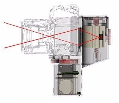 在原来相机放胶卷的位置,让 I'm Back 用一块聚焦屏替代,将胶卷成像改为通过聚焦屏落在I’m Back的相机模块上。