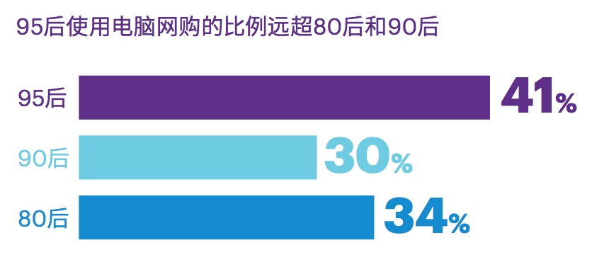 从去年双11,中国两大电商平台天猫和京东发布的数据来看,移动端订单的比例超过PC端。比起80后、90后,95后更依赖网购,而且他们借助更多的并非手机,而是电脑。