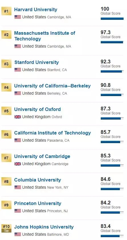 尽管是全球大学排名,但U.S.News还是将榜单中的好名次评给美国高校,共有221所美国大学上榜。完全不意外的是,哈佛大学又蝉联第一名,麻省理工学院、斯坦福大学和加州大学伯克利分校位列其后,分别位居第二、第三和第四。