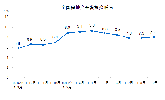 2017年1-9月份,全国房地产开发投资80644亿元,同比名义增长8.1%,增速比1-8月份提高0.2个百分点。