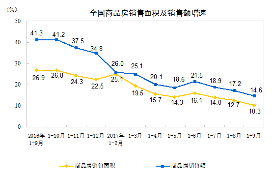 商品房销售面积116006万平方米,同比增长10.3%,增速比1-8月份回落2.4个百分点。9月末,商品房待售面积61140万平方米,比8月末减少1212万平方米。其中,住宅待售面积减少938万平方米,办公楼待售面积减少67万平方米,商业营业用房待售面积减少138万平方米。