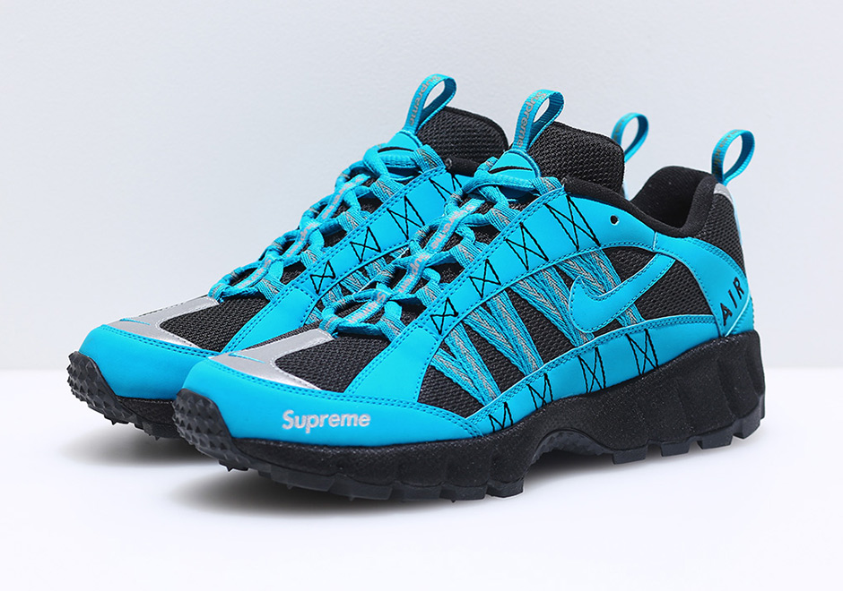 Supreme与Nike联名款即将来袭,此番以复古的Nike Air Humara为蓝本。该系列共有四款配色,分别为粉、蓝、荧光绿与纯黑色。鞋面由网状材质打造,并点缀3M反光细节,鞋头处则印有Supreme标志。