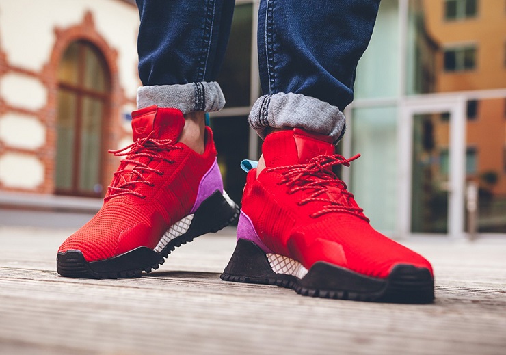低帮款ADIDAS AF 1.4 PK迎来更加鲜艳的配色,鞋身由防水的Primeknit材质打造,亮红色鞋面搭配鞋后跟的紫色麂皮材质。穿着上脚,更显亮眼。