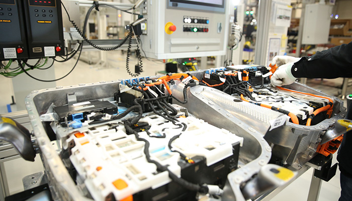 在参观过程中,界面汽车了解到宝马集团将目前使用的高压动力电池生产分为两个阶段,由供应商宁德时代提供的标准规格的锂离子电芯经自动检验后,组合成为更大的电池模组。随后电池模组与连接件、控制单元以及冷却单元一起整合在铝制外壳中,组装为完整的G38高性能动力电池组。最后将完整的高压动力电池单元适配到各款宝马车型中去。在电池组中包含了电池模组、电池联接系统(ZKS)、压板、张力板、绝缘箔、双面胶带和导热板,它们之间高精度的连接都通过先进的机器人技术来实现。