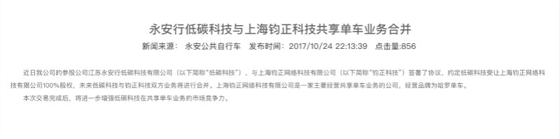 永安行表示,本次交易完成后,将进一步增强低碳科技在共享单车业务的市场竞争力。