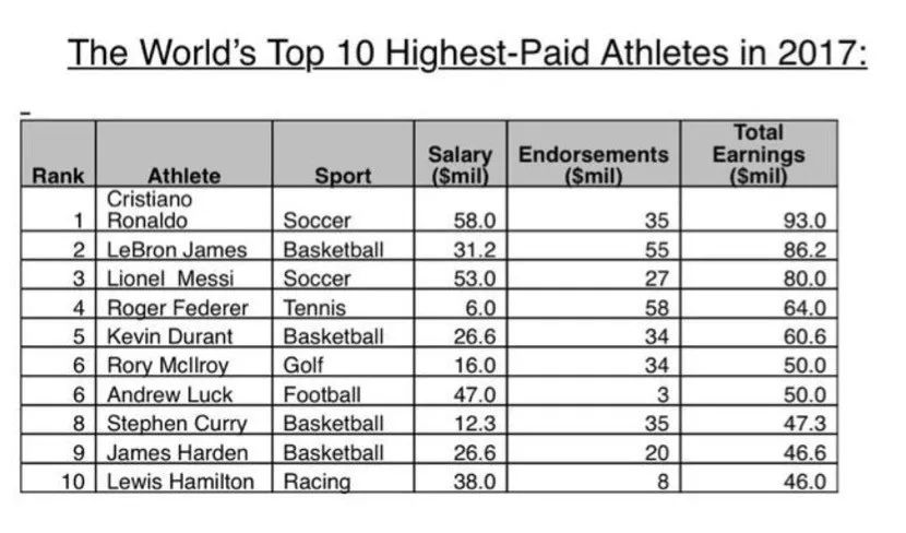 根据福布斯的数据统计,2017年,C罗是世界体坛收入最高的运动员,排名次席的是NBA球星勒布朗-詹姆斯,而梅西排名第3。在过去的一年,C罗在皇马的薪水和各种奖金达到5800万美元,赞助收入达到了3500万美元,以总收入9300万美元排名运动员收入榜首位,这也是他连续两年排名榜首。