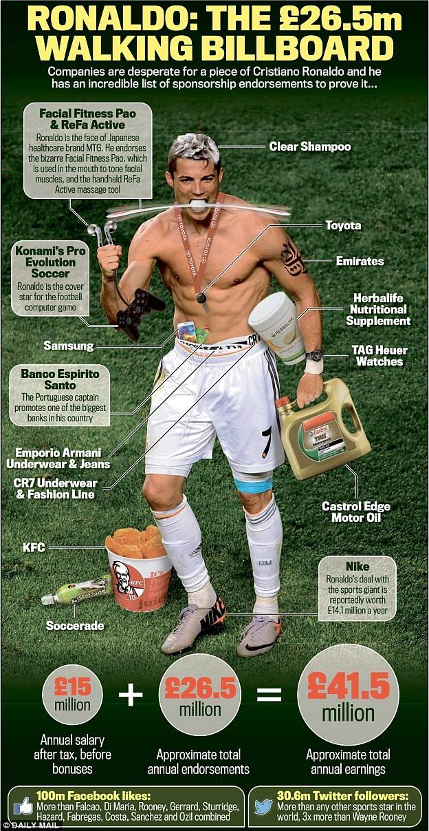 “全身都是宝”的C罗,所代言的品牌几乎涵盖了人们日常所需的方方面面。目前他拥有耐克,泰格豪雅和怪兽耳机等知名品牌赞助,球鞋、内裤、香水、牛仔裤甚至是宾馆饭店的营销业绩也都扶摇直上。他投资的房产遍布全球,包括投资了美国总统川普主导开发的川普大厦。