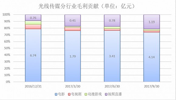 细看光线传媒2017第三季度的收入以及毛利率增长,可以发现在电影行业有所下滑的同时,视频直播行业却异军突起。自2016年起,视频直播行业就为光线传媒贡献了超过14%的收入,此后的2017年上半年,又为公司贡献了23%的收入以及17.5%的毛利。2017年第三季度,收入以及毛利的贡献占比进一步扩大到24%以及21%。