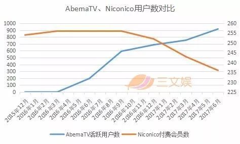 从2015年12月的254万,下降为2017年6月的236万,中间最多时也不过是256万,Niconico近两年的付费用户数增长成绩可以忽略不计。而从上面的折线图可以看出,在Niconico付费用户数停滞不前的时候,正是AbemaTV活跃用户数不断攀升的阶段,从2016年4月上线,AbemaTV的用户增长可谓迅猛。