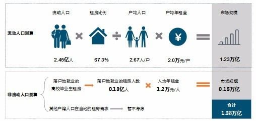 结合流动人口租房市场和非流动人口中高校毕业生租房市场,总租赁人口接近1.8亿人,租房市场规模达1.38万亿元。
