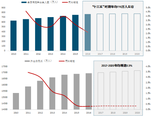 外出农民工、高校毕业生等人数持续增加,2020年流动人口规模将保持在2.4亿以上。2016年外出农民工占流动人口的比重接近70%,2017-2020年预计年均增长0.3%;另外部分高校毕业生等城镇户籍人口也是流动人口的重要组成,预计“十三五”时期我国高校毕业生规模年均增加770万左右。据此我们预测,2020年我国流动人口在2.42亿水平。